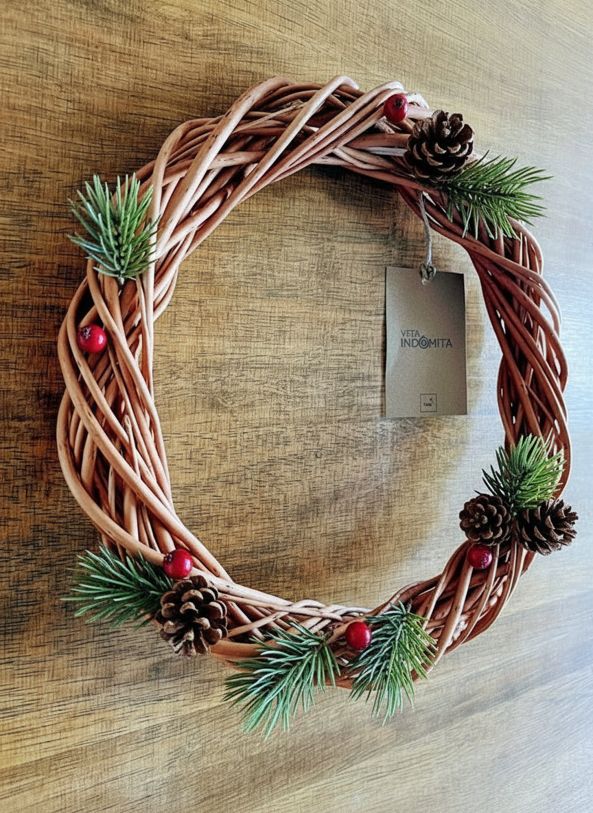 Corona circular de mimbre tejida a mano, con un diámetro de aproximadamente 30 cm . Esta base natural es perfecta para decorarla según tu estilo: con flores secas, lazos, piñas u otros adornos navideños.