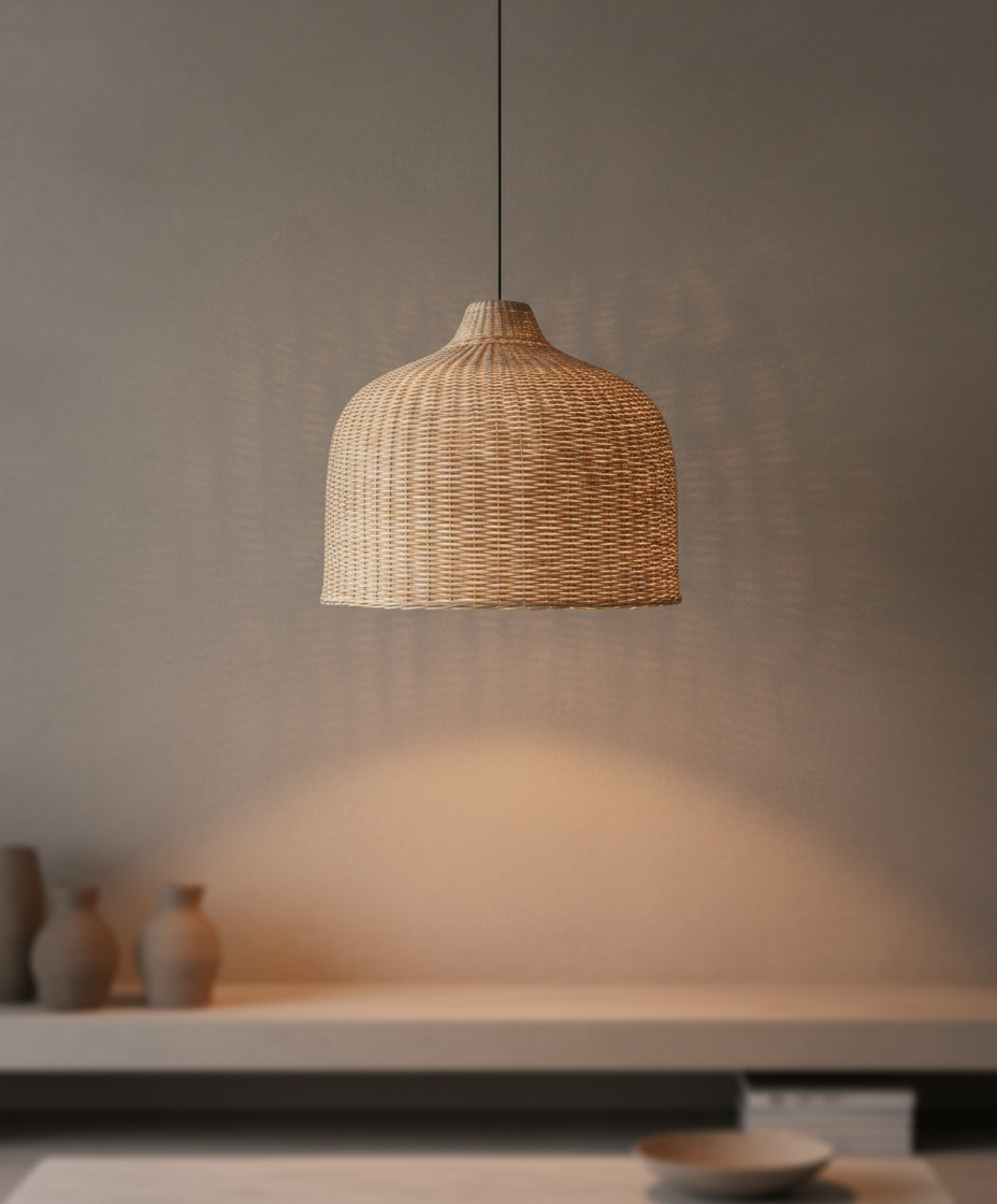 Sus generosas dimensiones (65 cm de diámetro x 60 cm de alto) la convierten en una protagonista ideal para espacios amplios como comedores, livings o terrazas cubiertas, donde su luz cálida aporta textura, identidad y calma.