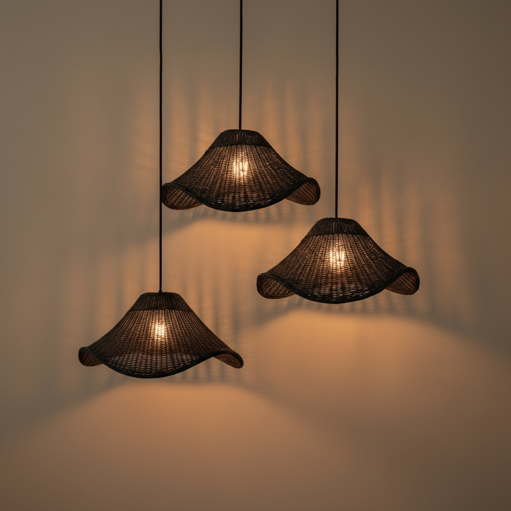 Elegante, orgánica y con mucha personalidad, la lámpara Mantarraya Negra de 60 cm es una pieza tejida a mano en Chile por artesanos de la zona central, manteniendo vivas las tradiciones del trabajo en mimbre.