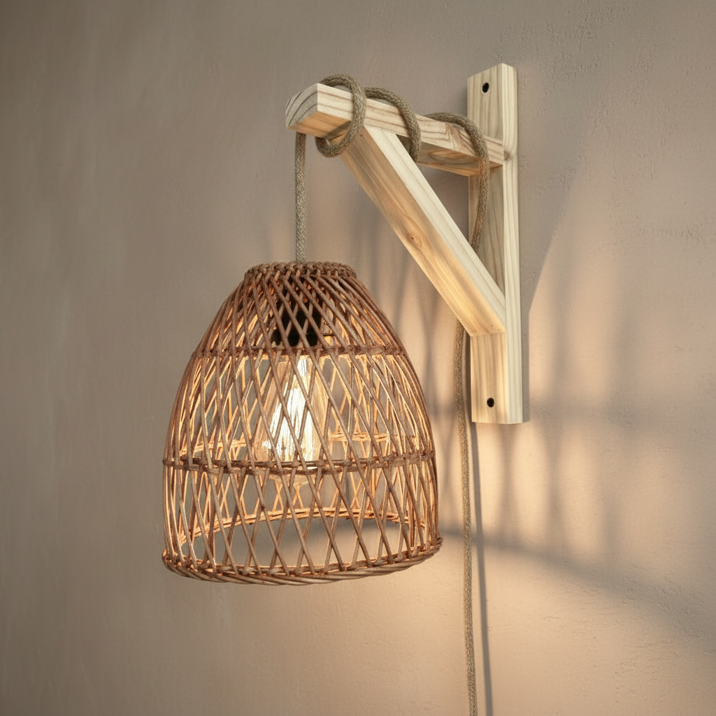 Incluye soporte tipo escuadra de madera de pino y un cable de dos vías de 2 metros, forrado en yute, con enchufe e interruptor listos para usar.
