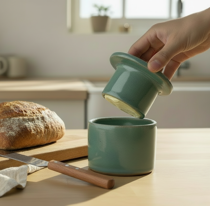 Conserva tu mantequilla siempre suave y untable con esta mantequillera francesa artesanal hecha a mano en cerámica gres. Su diseño inteligente, inspirado en la tradición francesa, permite mantener la mantequilla fuera del refrigerador en óptimas condiciones, evitando que se oxide o endurezca.