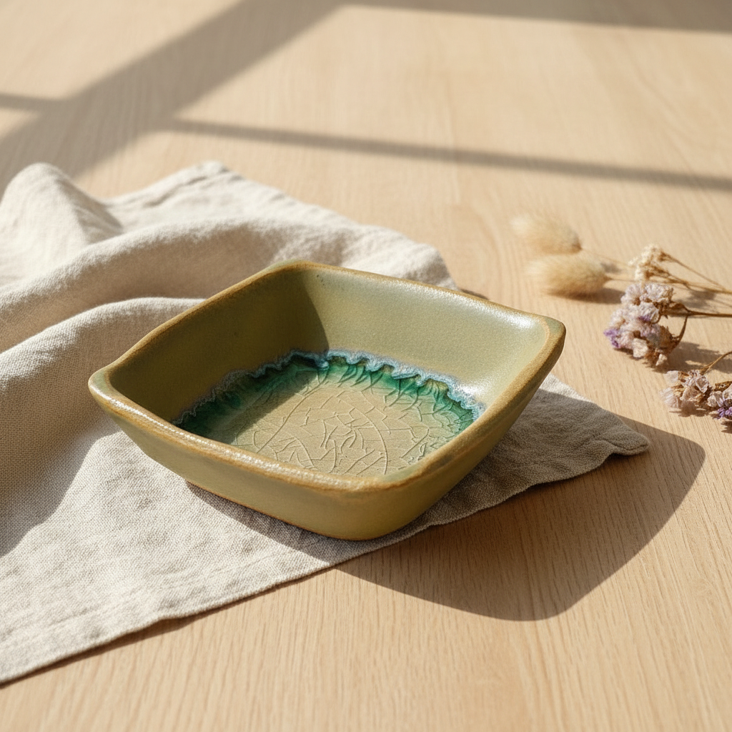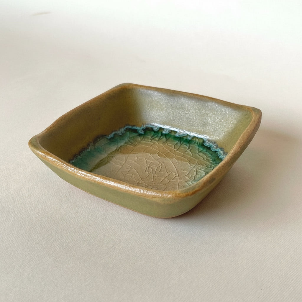 Pocillo Cuadrado de Cerámica Gres con Vidriado Verde Hecho a Mano